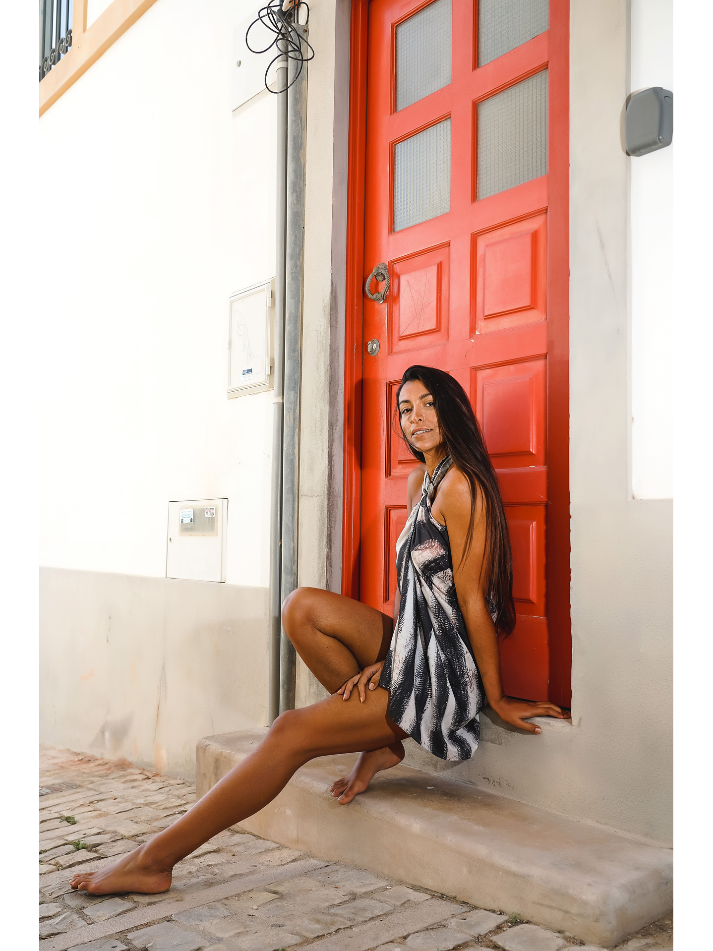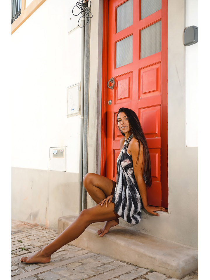 As nossas cangas medem 1mx1,45m. Na foto a modelo usa como blusa.